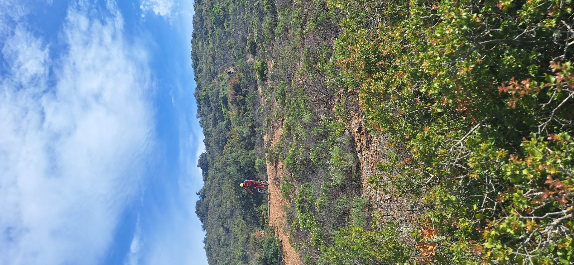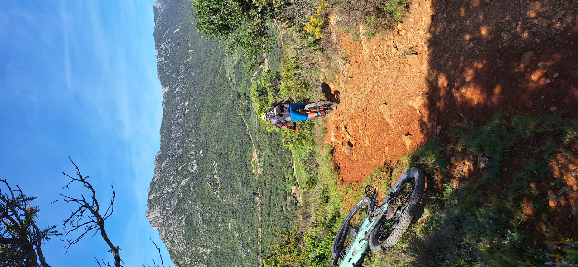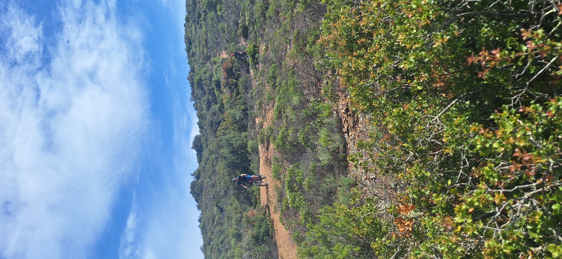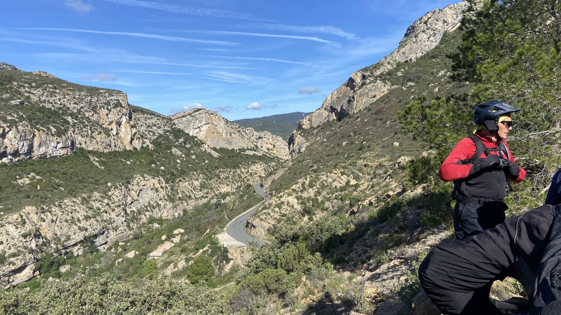 L'objectif était de rejoindre Cucugnan par le GR 367; au départ, nous avons rencontré des randonneurs qui nous ont demandé comment on comptait descendre là, ce qui personnellement m'a un peu inquiété mais j'ai commencé à descendre mais je suis pas allé très loin loin; au bout de 100m, j'ai mis pied à terre et finit la descente de 2 km à pied, voyant tous mes coéquipiers partir devant. Je pensais avoir beaucoup de retard sur eux mais quand je suis arrivé en bas, je me suis rendu compte que beaucoup avaient fini la descente à pied avec même une petite chute pour Francis.