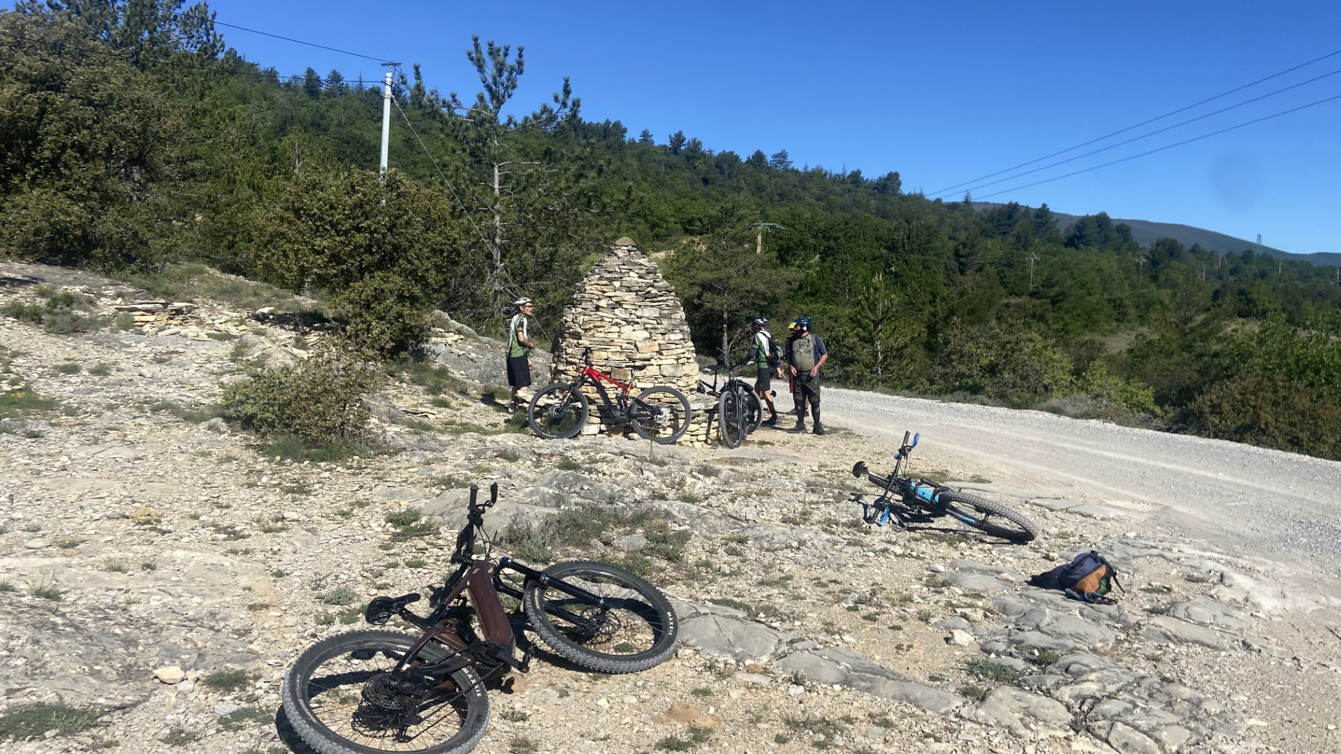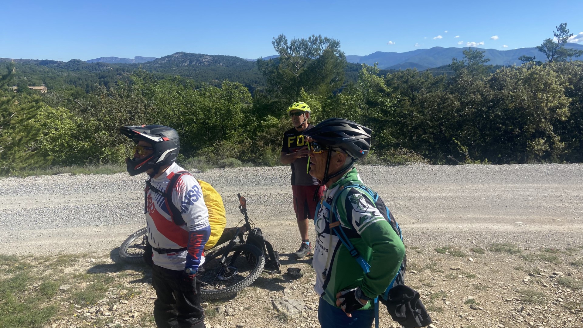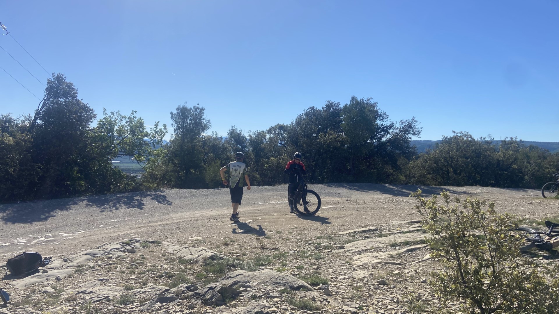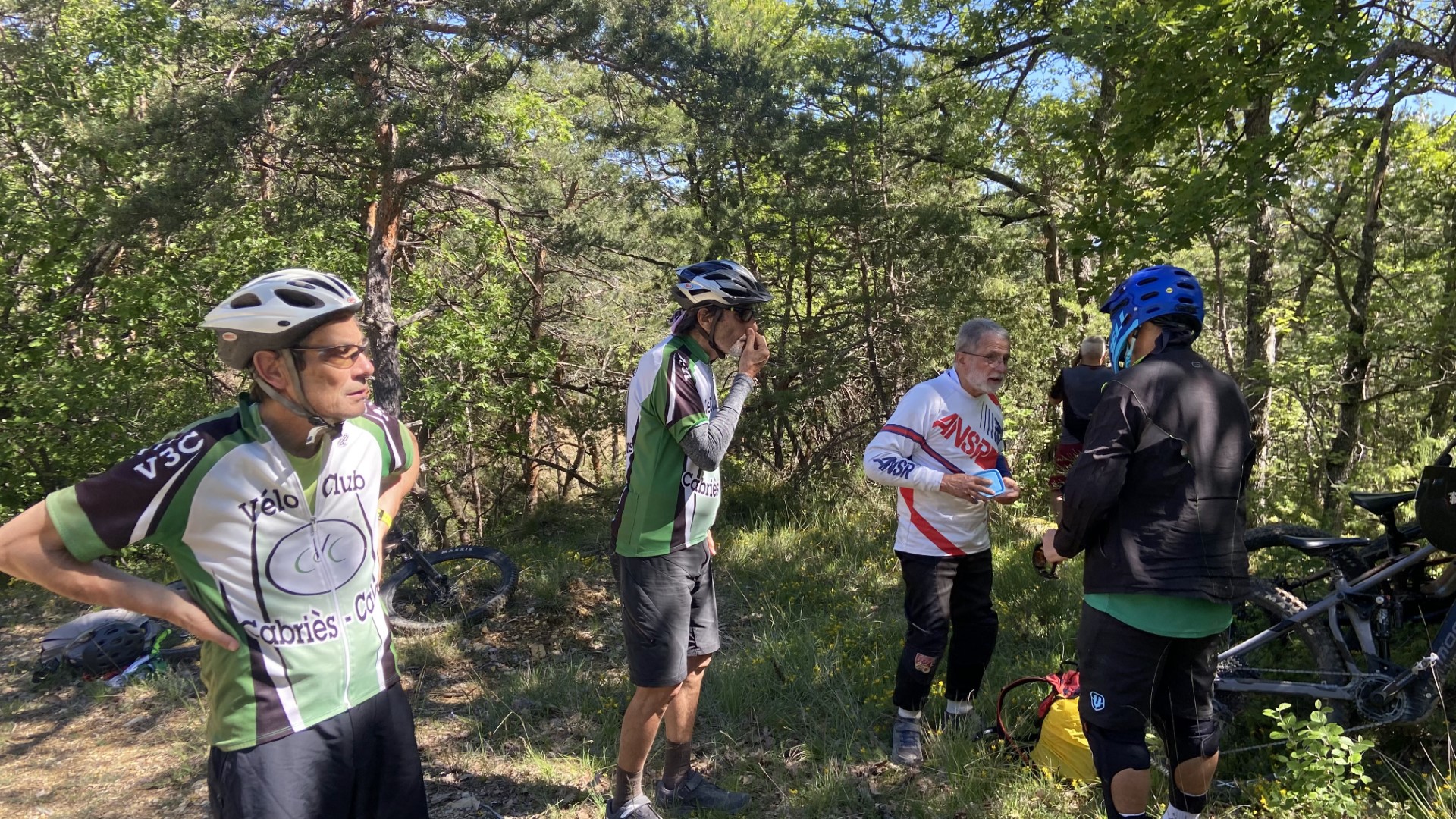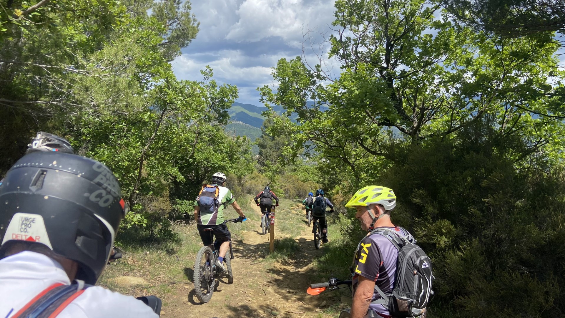 Nous sommes partis de l'office du tourisme à 9 heures pour grimper sur les hauts de Château-Arnoux jusqu'à rejoindre le GR 653D au lieu-dit La Peyrouse et de là nous avons pris la voie royale de Chante Puvine pour aller voir le Cairn de Puvine. Après, nous quittons la piste pour aller faire un tour dans les singles de la colline qui surplombe Peyruis. Puis retour par l'aérodrome de St Auban où on s'est arrêter un moment pôur se ravitailler, en empruntant des petits sentiers ludiques, et ensuite nous sommes aller retrouver 2 spéciales du parcours N° 15, tout d'abord les toboggans série de peitites montées et descentes puis la Jack Daniel, piste noire où on pouvait quand même éviter les sauts en les contournant.